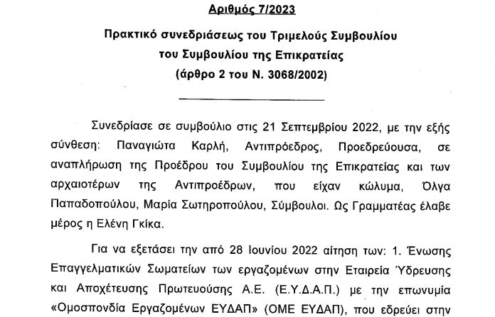 Σε συνέχεια σχετικών αιτήσεων στο ΣτΕ περί μη συμμόρφωσης (από σωματεία εργαζομένων και πολίτες), δημοσιεύθηκαν οι 7 & 8/2023 αποφάσεις του Τριμελούς Συμβουλίου Συμμόρφωσης του Συμβουλίου της Επικρατείας (Αντιπρόεδρος κ. Καρλή, Σύμβουλοι κ. Μ. Σωτηροπούλου και κ. Ο. Παπαδοπούλου, η οποία ήταν και η εισηγήτρια επί των υποθέσεων).