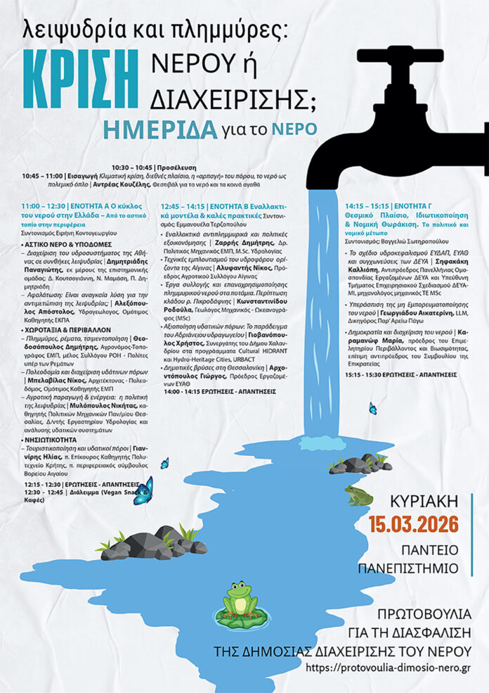 Σας προσκαλούμε στην ημερίδα που διοργανώνουμε την Κυριακή 15/3/2026 και ώρα 10:30, στο αμφιθέατρο Σάκη Καράγιωργα Ι (ισόγειο) για να συζητήσουμε την πραγματικότητα πίσω από την «απειλή» της λειψυδρίας και τις θεσμικές παρεμβάσεις που προωθούνται στο όνομα της κλιματικής κρίσης.